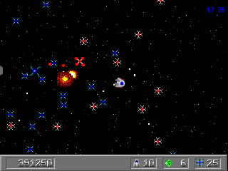 You're a rather jolly little ship dingus which shoots all around a rather abstract landscape collecting little blue crystally things, while avoiding a few mines scattered around. Hmm. Boring, you say? Well, maybe it still needs a certain something... OK, so we'll keep the Super Kill-o-Zapper, then, and add a couple of things to blow up. Happy?